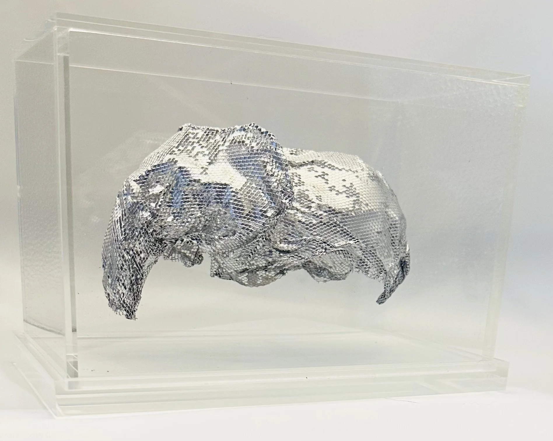 Hand-sculpted aluminium mesh with chrome lacquer in bespoke Perspex casing.